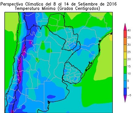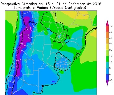 El centro del NOA, la mayor parte de Región del Chaco, el centro de Misiones, el sur de Corrientes, la mayor parte de Santa FE, el norte de Córdoba, el este de Buenos Aires, el este y el oeste del Uruguay, observarán temperaturas mínimas superiores a 5°C, con un foco con valores superiores sobre la mayor parte del Paraguay, el norte de la Región del Chaco, el este de Salta y la mayor parte de la Mesopotamia. El centro del NOA, la mayor parte de Cuyo, la mayor parte de la Región Pampera y la mayor parte del Uruguay, registrarán temperaturas mínimas entre 0 y 5°C con riesgo de heladas localizadas.
