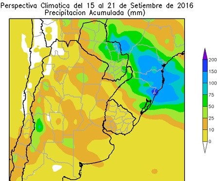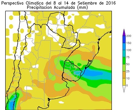 La mayor parte de la Mesopotamia, el este de la Región Pampeana y la mayor parte del Uruguay, observarán precipitaciones entre moderadas a abundantes (10 a 50 mm), con un foco con precipitaciones superiores 75 mm sobre el nordeste del Uruguay. El resto del área agrícola observará valores escasos (menos de 10 mm), con focos con valores moderados.