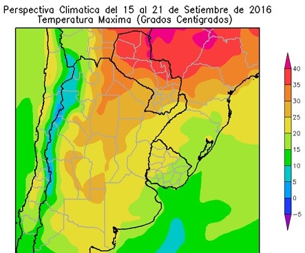 El este del Salta, la mayor parte de la Región del Chaco, la mayor parte de Santiago del Estero, el noroeste de Corrientes y el sudeste del Paraguay, observarán temperaturas máximas superiores a 35°C, con focos con temperaturas superiores a 40°C. El centro del NOA, el sur de la Región del Chaco, la mayor parte de la Mesopotamia, el norte de Córdoba, la mayor parte de Santa Fe y el extremo sudeste del Paraguay, observarán temperaturas máximas entre 30 y 35°C. El centro-oeste del NOA, el centro-oeste de Cuyo observarán temperaturas máximas entre 15 y 20°C.