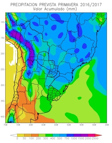 La mayor parte del área agrícola chilena, el área agrícola boliviana, la Región Occidental del Paraguay, el NOA, el oeste de la Región del Chaco, el centro y el oeste de Cuyo y el extremo noroeste de la Región Pampeana, donde el accionar de “La Niña” es positivo, comenzarán a registrar precipitaciones superiores a lo normal, con alta probabilidad de tormentas severas, con riesgo de granizo, aguaceros torrenciales y vientos. Cabe señalar que sobre el centro y el norte del área agrícola chilena y sobre Cuyo, dichos valores serán de escaso volumen, como lo determina el clima regional, pero superarán los niveles normales.