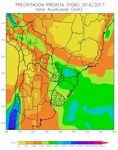 La mayor parte del área agrícola chilena, el área agrícola boliviana, la Región Occidental del Paraguay, el NOA, el oeste de la Región del Chaco, el centro y el oeste de Cuyo y el extremo noroeste de la Región Pampeana, donde el accionar de “La Niña” es positivo, seguirán observando precipitaciones superiores a lo normal, con alta probabilidad de tormentas severas, con riesgo de granizo, aguaceros torrenciales y vientos. Tal como se indicó para la primavera y el verano, cabe señalar que sobre el centro y el norte del área agrícola chilena y sobre Cuyo, dichos valores serán de escaso volumen, como lo determina el clima regional, pero superarán los niveles normales. El NOA entrará en forma temprana en la estación seca.