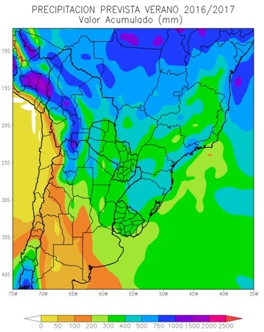 La mayor parte del área agrícola chilena, el área agrícola boliviana, la Región Occidental del Paraguay, el NOA, el oeste de la Región del Chaco, el centro y el oeste de Cuyo y el extremo noroeste de la Región Pampeana, donde el accionar de “La Niña” es positivo, continuarán registrando precipitaciones superiores a lo normal, con alta probabilidad de tormentas severas, con riesgo de granizo, aguaceros torrenciales y vientos. Tal como se indicó para la primavera, cabe señalar que sobre el centro y el norte del área agrícola chilena y sobre Cuyo, dichos valores serán de escaso volumen, como lo determina el clima regional, pero superarán los niveles normales.