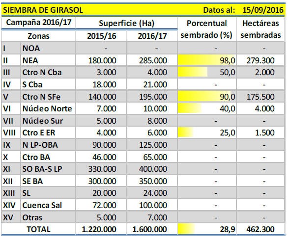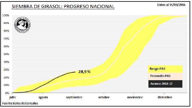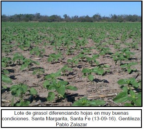 Sobre el núcleo girasolero del NEA, el avance de siembra alcanzó el 98 % restando sólo siembras puntuales sobre las localidades del centro de la provincia del Chaco. Las 280 mHas que se lograron implantar se encuentran diferenciando entre 2 a 6 hojas (V2-V6) dependiendo de la fecha de siembra, bajo condiciones de humedad que varían entre regular y adecuada. El estado en general del cultivo es bueno, donde las heladas registradas semanas atrás afectaron el crecimiento de algunos lotes puntuales de la región, pero de todas maneras no se esperan registrar elevadas pérdidas en cuanto al stand de plantas y al potencial de rendimiento. En cuanto al estado sanitario de los mismos, la presión es normal, relevándose en la localidad de Villa Ángela las primera aplicaciones preventivas para el control de cascarudos y orugas cortadoras.