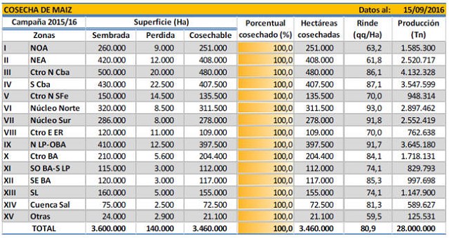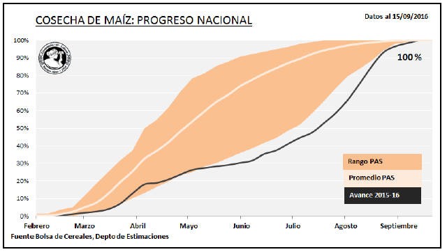 Durante la última semana, la cosecha de maíz con destino grano comercial culminó en toda el área agrícola nacional. A la fecha, solo restan recolectar cuadros puntuales tardíos y de segunda ocupación en el sur de la provincia de Bs. As. aunque no afectarían nuestra estimación de producción nacional. Luego de recolectar más de 3,46 MHa el rinde medio nacional se ubicó en 80,9 qq/Ha, acumulando una producción de 28.000.000 de toneladas para la campaña en curso. Las pérdidas a nivel nacional ascendieron a las 140.000 Ha, un 4 % de las 3,6 MHa implantadas durante la campaña 2015/16. La cosecha se concentró en las zonas PAS NEA, Sur de Córdoba y la provincia de Bs. As.