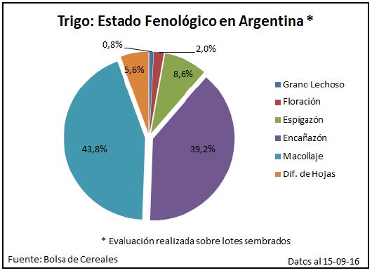 Durante la última semana la mayor proporción de los lotes implantados con trigo continuaron desarrollando las etapas críticas de su ciclo fenológico, bajo una condición de humedad que se mantiene estable en gran parte del país gracias a las precipitaciones registradas a comienzos del corriente mes. Nuestro relevamiento semanal indicó que un 43,8 % de las 4.300.000 hectáreas implantadas se encuentran en etapa de macollaje, concentradas principalmente sobre los núcleos trigueros del sur bonaerense. A su vez, un 39,2 % de los lotes de trigo transitan la etapa de encañazón y un 8,6 % ya se encuentra espigado. En las regiones NOA y NEA, el cereal se encuentra transitando las etapas de encañazón y espigazón, donde también se relevaron lotes tempranos de trigo que ya están comenzando el llenado de grano.