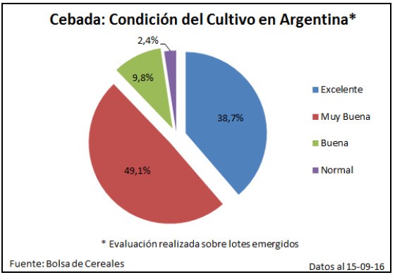 Durante los últimos quince días los lotes de cebada con destino grano comercial comenzaron a desarrollar las etapas de macollaje y encañazón en los principales núcleos del país. Las precipitaciones registradas durante el mes de septiembre permitieron lograr una condición de humedad adecuada a óptima para que el cereal comience a transitar los etapas más críticas de su ciclo fenológico. En función al relevamiento realizado, el 49,1 % de las 950.000 hectáreas sembradas con cebada presenta una condición de cultivo muy buena, mientras que otro 38,7 % es excelente y solo una menor proporción de 2,4 % se encuentran con una condición normal.