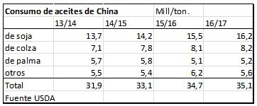 China consume por año cerca de 34 millones de toneladas de aceite. De este volumen, ¡casi la mitad corresponde a aceite de soja!