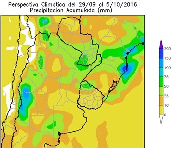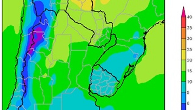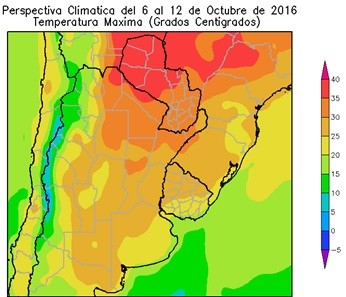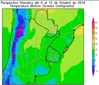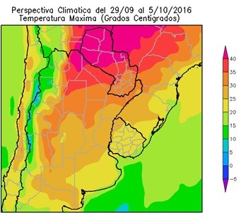 La perspectiva comenzará con una entrada de vientos del sector sur/sudeste provocando un marcado descenso térmico. Todo el oeste y el sur del área agrícola argentina y la mayor parte del área agrícola uruguaya, observarán temperaturas mínimas por debajo de 10°C. Los vientos provenientes del sector norte retornarán rápidamente, aportando calor y humedad produciendo temperaturas máximas superiores a lo normal para la época.