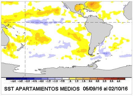 Si bien agosto y parte de septiembre mostraron vastos sectores con zonas de precipitaciones deficitarias, las mismas son especialmente esperables y llevaderas en ese período del año y por otra parte, septiembre es un mes de transición que suele transcurrir con un adelanto o un atraso en la renovación de la oferta de agua. Queremos decir en definitiva, que los sectores que vienen quedando atrasados en los acumulados pluviales no pueden ligarse al ligero enfriamiento del Pacífico. Una forma complementaria de interpretar la actualidad de este indicador es que su efecto negativo sobre las lluvias de primavera, suele ser significativo y bajo estas circunstancias no deberían haberse observado las lluvias en la franja mediterránea. Por lo tanto, las bondades y defecciones del patrón pluvial actual se rigen bajo la influencia de la escala regional y en esta escala deberemos encontrar las explicaciones de los vaivenes de las dos variables principales del clima en lo que resta de este trimestre.