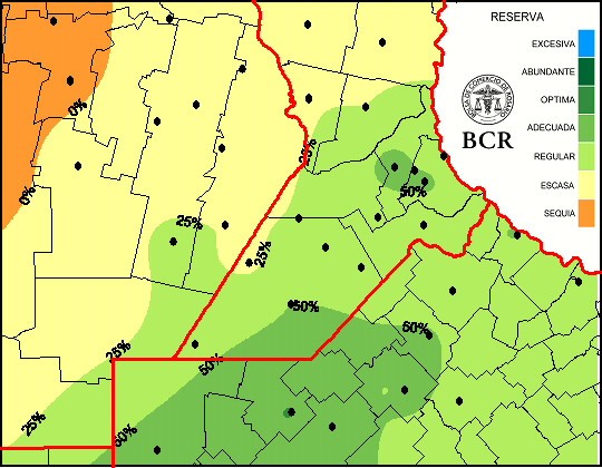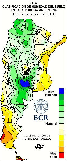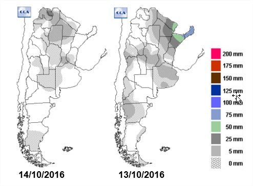 Asimismo los cultivares de trigo siguen respondiendo favorablemente a las lluvias caídas. Las precipitaciones sobre la región siguen sumando reservas de agua en el suelo, por lo que toda la zona ha mejorado el contenido de humedad edáfica respecto de lo que se veía a fines de septiembre. En lo que va del mes los mayores acumulados se dieron en la zona de General Villegas y General Pinto (noroeste de la provincia de Buenos aires) con registros entre 84 y 86 mm. Se destaca el mayor acumulado del mes en la localidad de Chacabuco (93 mm) gracias al aporte de los 60 mm caídos el día miércoles (12/10). Para los próximos días se esperan tormentas en toda la región pampeana. Los fenómenos serán dispares e intensos, presentándose en distintos momentos de la semana.