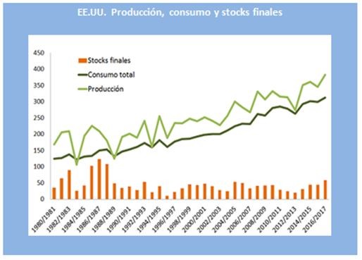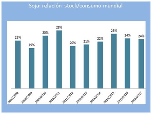 Pese a la superproducción que habría en la siguiente campaña, no se prevé que los stocks superen el nivel alcanzado en el ciclo 2014/15, cuando alcanzó a 78,36 millones de toneladas. Para el ciclo 2016/17, se estima tan sólo 77,36 millones.