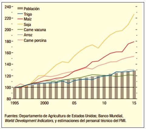 El gráfico nos muestra la evolución de la población y del consumo de alimentos a nivel mundial, desde 1995 (índice 1995=100), tomado del informe del FMI de octubre de 2016.