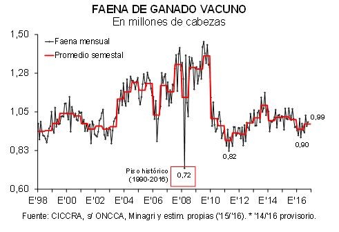 La industria frigorífica faenó 991 mil cabezas de hacienda vacuna durante octubre de 2016, nivel que resultó apenas 3,2% superior al promedio mensual del corriente año y que se mantuvo por debajo del correspondiente a octubre de 2015 (-1,8%).