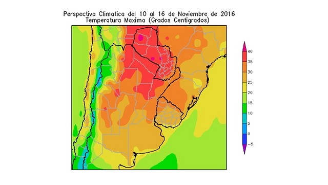 La mayor parte del Paraguay, el extremo nordeste del NOA, la mayor parte de la Región del Chaco, el extremo norte de la Región Pampeana y el oeste de Corrientes experimentarán temperaturas máximas de más de 35 °C, con focos cercanos a 40 °C.