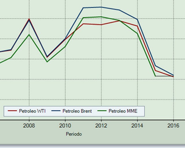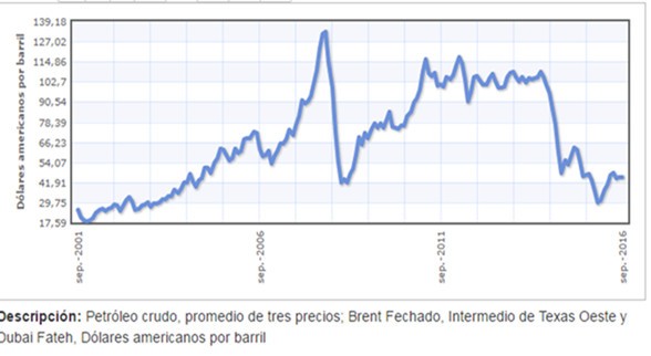 Este cuadro muestra la evolución de los últimos 10 años del precio en dólares del petróleo (en sus distintas variantes).