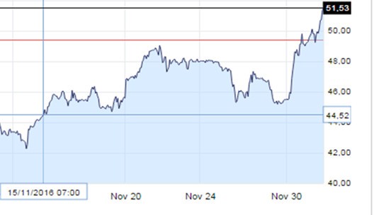Petróleo (Brent): precio en dólares desde mediados de noviembre