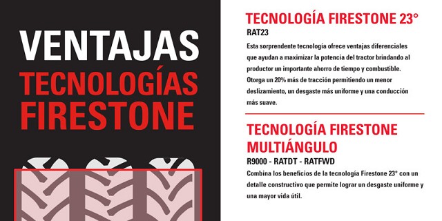 Bridgestone, la compañía de neumáticos más grande del mundo desarrolló a través de su reconocida marca Firestone, productos exclusivos que permiten al productor obtener el mayor rinde por campaña. Estas tecnologías fueron diseñadas para adaptarse a cada necesidad.