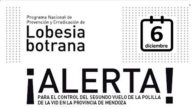 El Servicio Nacional de Sanidad y Calidad Agroalimentaria (Senasa), junto al Instituto de Sanidad y Calidad Agropecuaria Mendoza (Iscamen) informan que a partir del próximo 6 de diciembre estará vigente el segundo alerta para el control químico/biológico de la polilla para Valle de Uco, en la provincia de Mendoza.