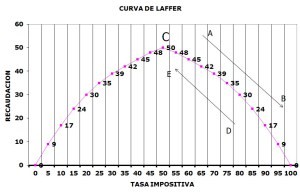 En el eje horizontal se muestran las tasas del impuesto y en el eje vertical cuánto se recauda a cada nivel de tasa de impuesto. En la medida que se va aumentando la tasa del impuesto, crece la recaudación. Pero llega un punto máximo, el C, a partir del cual el estado recauda menos porque las empresas dejan de producir dado que la carga impositiva es insostenible, la gente pasa al mercado informal o las empresas se van del país.