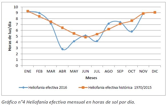 Respecto a esta variable meteorológica, se evidencia en el grafico n°4 que las horas de luz por día estuvieron por debajo de la media en el bimestre abril-mayo en los meses de julio y octubre. Esta variable se vio afectada directamente por la predominancia de días con inestabilidad durante el primer semestre, siendo récord de reducida luminosidad el mes de abril como consecuencia del temporal explicado en líneas anteriores.