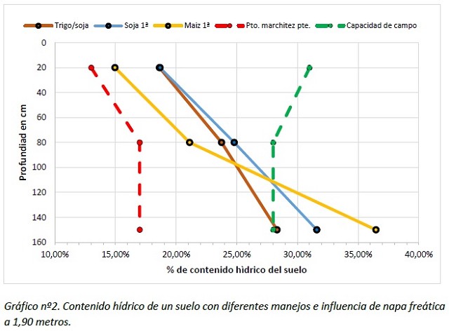 En el gráfico nº2 se observa el contenido hídrico en porcentaje, para facilitar la comparación entre la ocupación de cultivo y los contenidos hídricos de punto de marchitez permanente y capacidad de campo. El contenido hídrico del perfil de suelo muestreado cuenta con influencia de napa a 1,90 m y tiene diferentes cultivos implantados (trigo/soja2ª, maíz 1ª y soja 1ª).