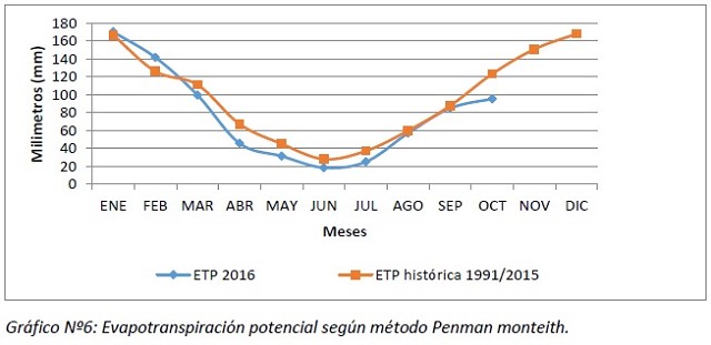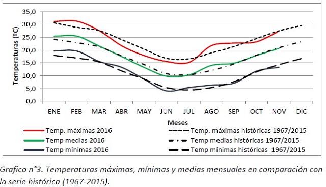 En este año, a diferencia de 2015, se manifestó una rápida salida del invierno, con temperaturas en ascenso que no dieron lugar a heladas tardías. Sólo el mes de septiembre presentó temperaturas máximas superiores a lo normal y luego hasta el día de la fecha los valores térmicos siguieron valores normales.