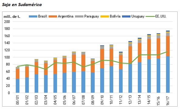 Dicho contexto difiere del mercado de soja, donde a pesar del aumento que se proyecta en la oferta, la demanda muestra mayor crecimiento aun cuando Estados Unidos obtiene una producción record.