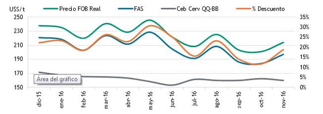Analizando las exportaciones de cebada cervecera a granel y los precios declaradas por AFIP, para el período 28 de diciembre de 2015 hasta el 11 de noviembre de 2016, se observa que el principal destino de la cebada cervecera argentina fue Latinoamérica, con Brasil a la cabeza (52%), y Colombia (22%) y Perú (9%) completando el podio. El promedio ponderado, del valor FOB real exportado asciende a 218 u$s/t.