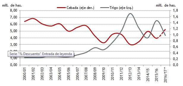 Gráfico 1: Evolución del área sembrada con cebada y trigo en Argentina. Fuente: Globaltecnos en base a Minagro.