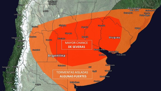 Mientras, desde el Oceano Pacifico, va a ir ingresando una perturbacion de mal tiempo en los niveles altos, dando origen a la formacion de tormentas severas (especialmente durante la noche del dia sabado y en el transcurso del dia domingo), especialmente sobre Cordoba, centro/sur de Santa Fe, Entre Rios, Republica Oriental del Uruguay y el norte de la provincia de Buenos Aires, con el riesgo para fuertes a intensos chaparrones en un corto periodo de tiempo, ademas de fuertes a muy fuertes rafagas de viento, caida de granizo de variados tamaños(de pequeños a medianos) en forma abundante y aislada y actividad electrica.