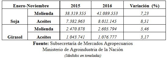 El incremento es consecuencia de las mayores moliendas de soja y girasol, que treparon 7,23% y 5,46% respectivamente, al industrializarse 41.089.553 toneladas de soja y 2.605.794 toneladas de girasol durante los once meses señalados.