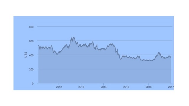 El gráfico que sigue muestra la evolución del precio en Chicago, a lo largo de los últimos años.