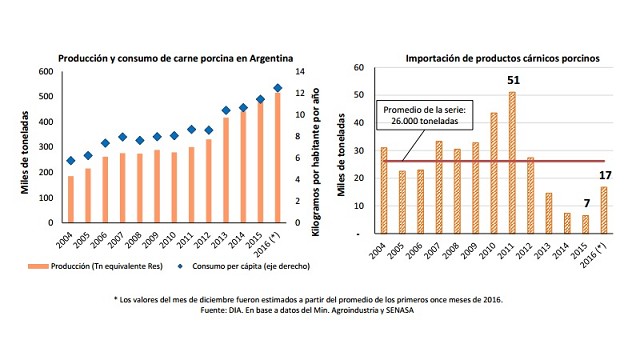 Durante 2016 la producción de carne porcina marcó un nuevo record al superar por primera vez las 500 mil toneladas producidas, lo que implica un crecimiento del 6% frente a 2015. A fuerza de un precio competitivo, la carne de cerdo fue ganando un lugar en la mesa de los consumidores, traducido en un incremento ininterrumpido del consumo por habitante en los últimos 15 años, llegando a la actualidad a un promedio de 12,5 kilogramos/año por persona. Pese al buen desempeño en el ámbito productivo, referentes del sector señalan que ha existido una pérdida de rentabilidad frente a años anteriores, principalmente por el aumento de costos.