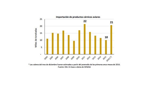 Si bien las operaciones de exportación obtuvieron una mejora en la competitividad tras el ajuste en el tipo de cambio de fines de 2015, ésta se vio erosionada a lo largo de 2016, ya que entre enero y diciembre la depreciación de la divisa fue del 16%, mientras que la inflación medida por la Dirección General de Estadística y Censos de la Ciudad de Buenos Aires fue del 41%. El contexto mundial tampoco ayudó, ya que las bajas cotizaciones del petróleo durante gran parte de 2016 afectaron a los principales clientes de nuestro país, entre ellos Arabia Saudita, Emiratos Árabes y Venezuela, conduciendo a una fuerte reducción en sus compras. Por otro lado, la crisis económica de Brasil condujo a excedentes en su producción aviar (también en porcinos), que fueron volcados hacia nuestro país a precios competitivos, fenómeno que explica el crecimiento del 104% en las importaciones. Si bien es uno de los mayores volúmenes que se han adquirido al exterior en términos históricos, representan tan solo el 1,2% del consumo doméstico de carne aviar.
