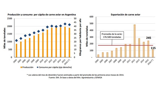 La industria de carne aviar atravesó un difícil 2016, cerrando el año con una merma en la producción del 4% respecto a 2015. Si bien el consumo interno disminuyó en términos interanuales un 2%, el principal impacto provino del frente externo, con una caída del 53% en las exportaciones.