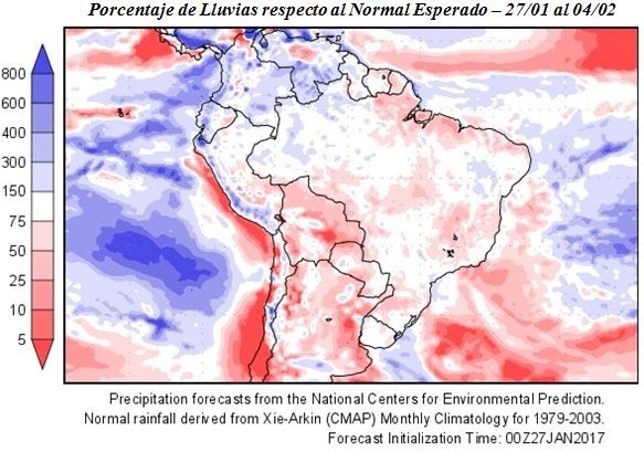 Nos parece de interés mostrar una salida de un modelo que elabora el INSTITUTO COLA IGES, DE USA y que entre sus productos produce un mapa con los porcentajes de lluvias en un dado período, en este caso, el que comprende que va del 27 de enero al 4 de febrero.