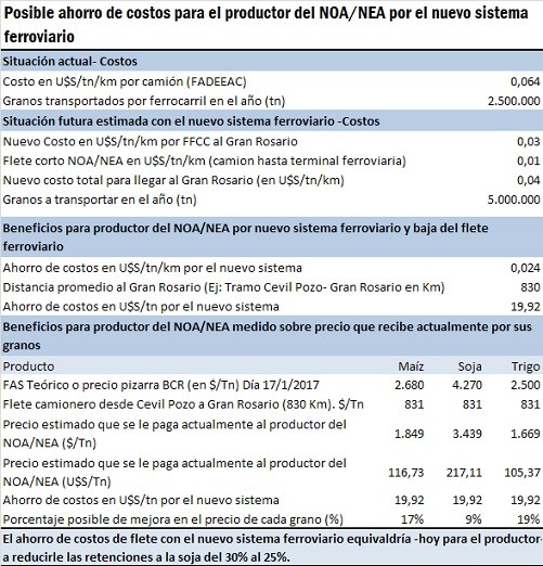 • Suponemos que los productores del NOA/NEA por lo general reciben por la venta de sus granos un precio en $/tn equivalente a restarle al precio de pizarra de la Cámara Arbitral de la Bolsa de Comercio de Rosario, el flete camionero que rige desde su chacra en el NOA/NEA a las terminales portuarias del Gran Rosario. Por comentarios de productores, esto sucede –aún- cuando la mercadería es transportada por ferrocarril que tiene menores costos que el camión.