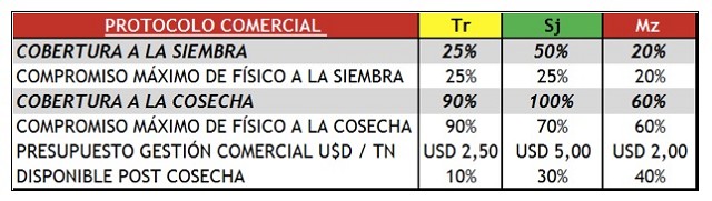 Podríamos dedicar horas y horas a estas cuestiones, pero nuestras empresas no viven de "Conjeturas Periodísticas" sino de Resultados, por eso lo que debemos hacer siempre; y más aún en medio del Océano de Incertidumbre, es seguir nuestra Hoja de Ruta Comercial; esto es lo que algunos llaman "Protocolo Comercial" y no es más que una hojita, que podría estar escrita en lápiz, y siempre sugerimos hacer al principio de cada campaña. Es ni más ni menos que escribir cómo iremos comercializando nuestra producción a lo largo de la Campaña y cuánto presupuestamos de Gastos para la Gestión Comercial, de la misma manera que presupuestamos funguicidas , herbicidas o semilla. Un ejemplo de esto podría ser lo que sigue; tomado de una empresa con 100% campo arrendado, que asesoramos en la actualidad. No hay que copiar los % de Cobertura, los cuales dependerán de nuestras necesidades financieras y a su vez de cada Modelo de Empresa en particular, pero SI el concepto de escribirse una hoja de ruta para luego respetarla durante el partido. Esta Hoja de Ruta facilita mucho las decisiones en medio del camino, como lo hace la Hoja de Ruta del Navegante en un equipo de Rally...