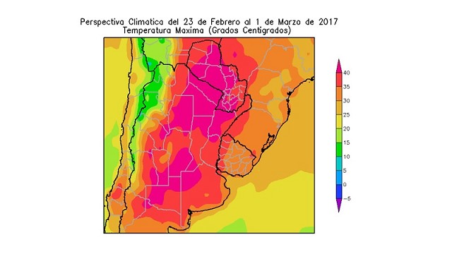 • La mayor parte del área agrícola argentina, la mayor parte del área agrícola del Paraguay y el oeste del Uruguay, observarán temperaturas máximas superiores a 35ªC con amplios focos con temperaturas superiores a 40°C.