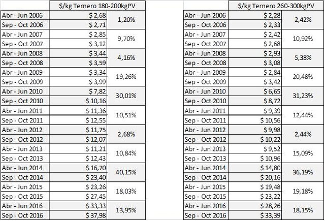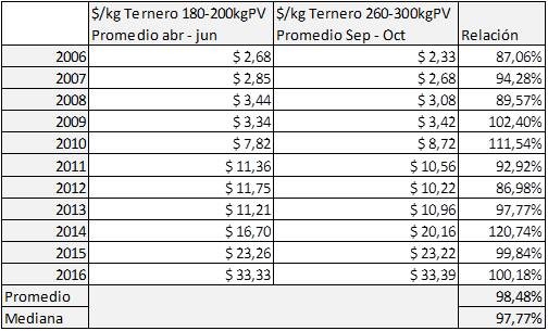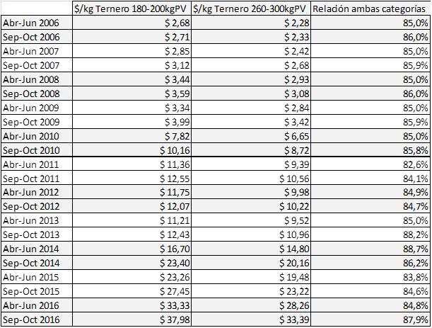 Para iniciar el ejercicio nos planteamos un sistema de recría de terneros que inician el proceso con un peso de ingreso de 180 y 200 kg PV y que en un plazo de aproximadamente 5 meses sale a la venta con un peso que oscila entre 260 y 300 kg PV. Para ambas categorías se tomaron los promedios de precios entre los meses de abril y junio por un lado, y el promedio de los meses de septiembre y octubre por el otro para cada año.