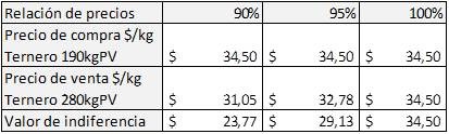Dado el fuerte impacto que tiene esta relación de precios en el tipo de negocio planteado, ya sea como costo real en el caso de compra de terneros, o como costo de oportunidad si los mismos son propios, resultaría conveniente hacer algún tipo de análisis de sensibilidad que nos acerque a los posibles resultados a obtener.