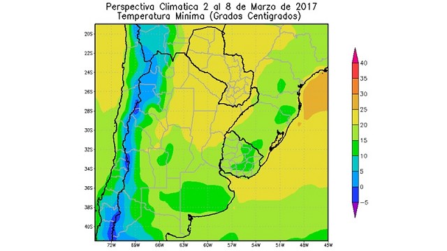 • El centro del NOA, el sur de la Región Pampeana, el sur de la Mesopotamia, la mayor parte de Cuyo, y la mayor parte del Uruguay observarán temperaturas mínimas entre 15 y 20°C, con focos de valores menores.