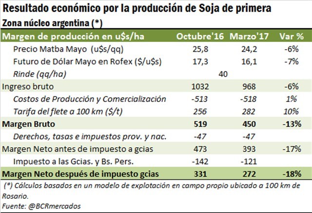 El cálculo de los márgenes fue realizado con un modelo de campo propio ubicado a 100 km de las terminales de Rosario. Además, consideró un rinde de 40 quintales por hectárea. Con estos supuestos, el margen bruto desde la siembra a la cosecha bajó de US$ 519 a 450 por hectárea, una baja del 13 por ciento.