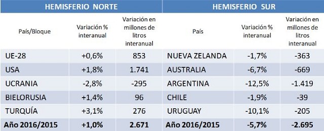 Como puede observarse en el cuadro los volúmenes de crecimiento en un hemisferio y los de caída en el otro son muy similares, aunque pequeñas subas porcentuales en el hemisferio norte (+1,0%), compensan importantes caídas porcentuales en el hemisferio sur (-5,7%), producto de la gran diferencia de tamaño de ambas lecherías.