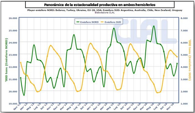 En el gráfico siguiente se pueden ver las diferencias estacionales de producción de ambos hemisferios y dentro de esa estacionalidad la variación del último año.