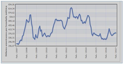 El gráfico que sigue revela el comportamiento del valor de la soja en Chicago a lo largo de 10 años.