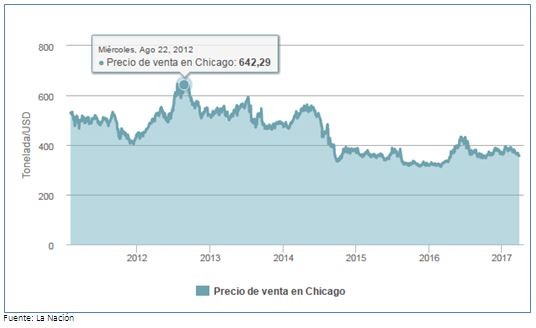 La pendiente negativa, desde aquellos gloriosos días de agosto de 2012 hasta el presente, es clarísima, aunque hubo un interesante pico en junio del año pasado, cuando la soja en Chicago superaba el precio de 420 dólares.