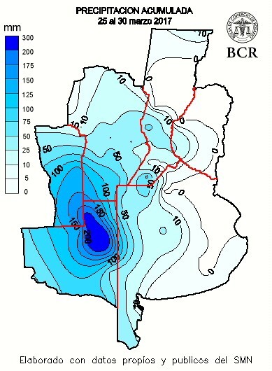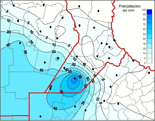 En las últimas 24 horas el frente se desplazó un poco al este, extendiendo su acción sobre buena parte de la región núcleo. En el sur de Santa Fe se midieron los mayores acumulados. Santa Teresa encabeza el ranking con 80 mm. Le siguen Rufino con 40 mm. En el oeste de Buenos Aires, General Pinto y Villegas, estuvieron apenas por debajo de los 40 mm. Las lluvias también llegaron al sur y oeste de Córdoba. En Bengolea y Guatimozín se midieron entre 30 y 35 mm.