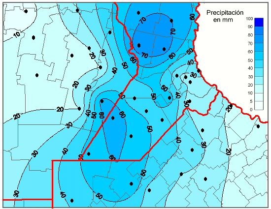 El frente que siguió produciendo lluvias muy intensas en la franja oeste del país, alcanzó en este fin de semana a la región núcleo. Dos fueron los focos principales de acción: el centro-sur de la provincia de Santa Fe y la porción que une el sudoeste de Santa Fe, parte del sudeste de Córdoba y noroeste de Buenos Aires. El área más afectada la comprende las localidades santafesinas de Montes de Oca, Irigoyen, Classon y Carlos Pellegrini. Acumularon entre 78 y 66 mm. El segundo foco recibió precipitaciones del orden de los 50 a 70 mm, destacándose las marcas de Maggiolo (Santa Fe) y Guatimozín (Córdoba) con 68 mm, y los 60 mm de General Pinto (Buenos Aires).