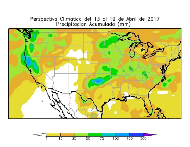 La perspectiva comenzará con precipitaciones moderadas a abundantes en la mayor parte norte y el centro del área agrícola norteamericana, mientras que el extremo oeste y gran parte del sur de su extensión observarán valores escasos. Paralelamente, tendrá lugar la entrada de aire frío procedente del noroeste, produciendo un marcado descenso de la temperatura, debajo de lo normal para la época, con riesgo de heladas en todo el norte y el centro-norte del área agrícola norteamericana. Posteriormente, los vientos rotarán al sur, trayendo condiciones de tiempo seco con temperaturas máximas dentro de lo normal. La evolución del clima mostrará varios riesgos: Lluvia fuerte en porciones de California, la Gran Cuenca Central y el noroeste del Pacífico.16 y 17 de Abril; Lluvia intensa en partes de las Planicies centrales, los Grandes Lagos, el Valle Medio del Misisipí, las Llanuras Sureñas y el Valle Superior del Misisipi.13 de Abril; Fuertes lluvias en las porciones de las Planicies centrales, el Valle del Misisipí Medio, los Grandes Lagos, el Valle de Ohio y el Valle del Alto Mississippi, 15 de Abril; Fuertes nevadas en parte de las Rocallosas del Norte y la Gran Cuenca del Norte, 14 de Abril; Posibles Inundaciones en porciones de las Llanuras meridionales; Posibles inundaciones en porciones del Valle Medio del Mississippi; Posibles e inminentes inundaciones en las Planicies del norte, en la gran Cuenca del norte, el Valle medio de Mississippi, el Valle superior de Mississippi, y de los Grandes Lagos; Severa Sequía en gran parte de Arizona, California, las Grandes Llanuras del centro y sur, la Región Sudeste y pequeñas porciones del noreste.